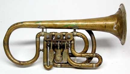 Perinet-piston E-flat cornet by J.W. Pepper, Philadelphia & Chicago. Dates to about 1890. Serial # 7795. Brass. High Pitch, approx A=454vps. .445" bore. Length is 12-3/8" without mouthpiece. Very good unrestored condition except for 2 splits at the bellrim. Comes with original mouthpiece, lyre, cleaning rod & case in fair condition. •••SOLD•••