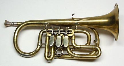 Top-action rotary valve (TARV) E-flat cornet by Schuster, Markneukirchen. Circa 1870. Brass with German-silver trim & bell garland. High Pitch, approx A=456vps. Bore is .435". Length is 12-1/4". Sold with original mouthpiece, but no other accessories. Very good playing condition. •••SOLD•••